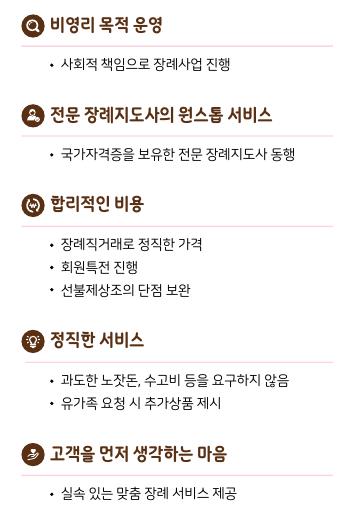 또한 저희 행복의전은 고인을 생각하는 마음과 장례비용은 절대 비례하지 않는다는 생각으로 사회적 가치를 목적으로 장례 사업을 진행하고 있으며, 고인과 유가족에게 최고의 예우를 다하는 마음으로 마지막 여정에 행복한 동행으로 기억될 수 있도록 다양하고 실속 있는 장례 서비스를 합리적인 비용으로 제시하여 정직한 서비스를 제공하겠습니다.